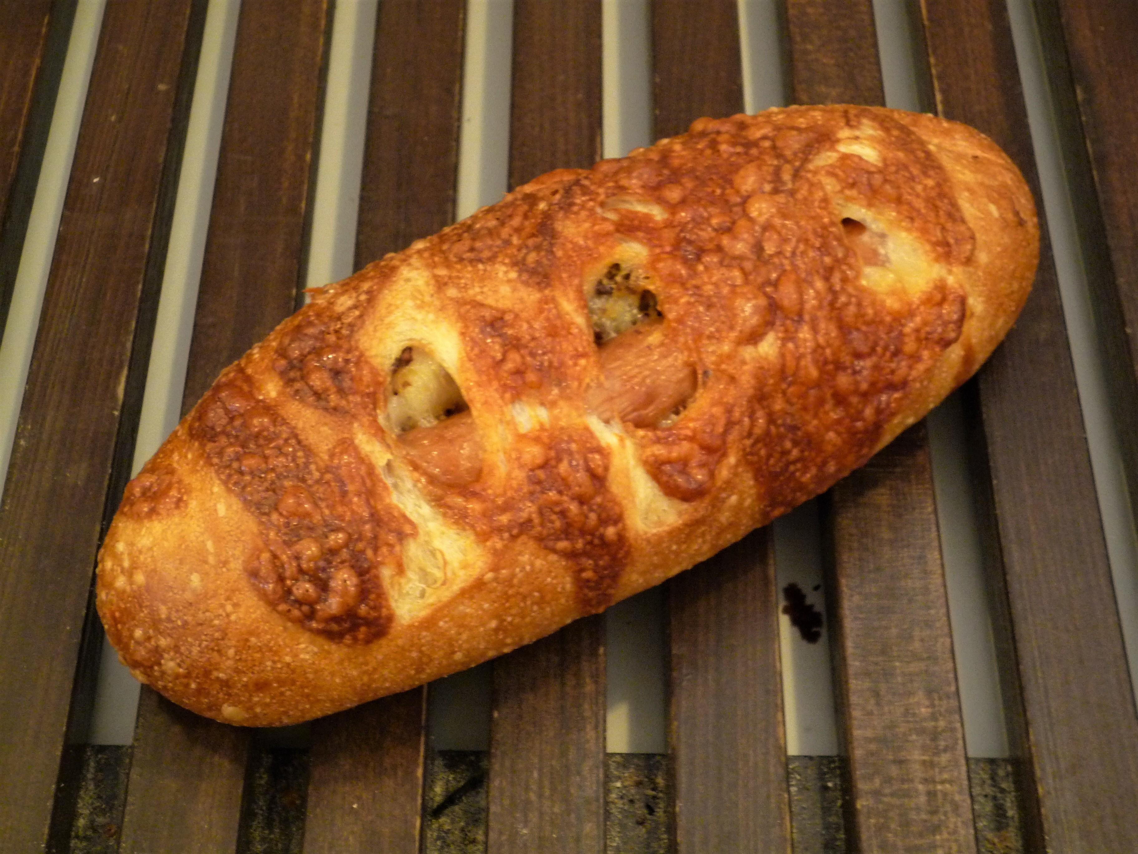 自家製酵母を使用したトマト生地に、ベーコンとモッツァレラチーズを巻き込んで焼き上げました。