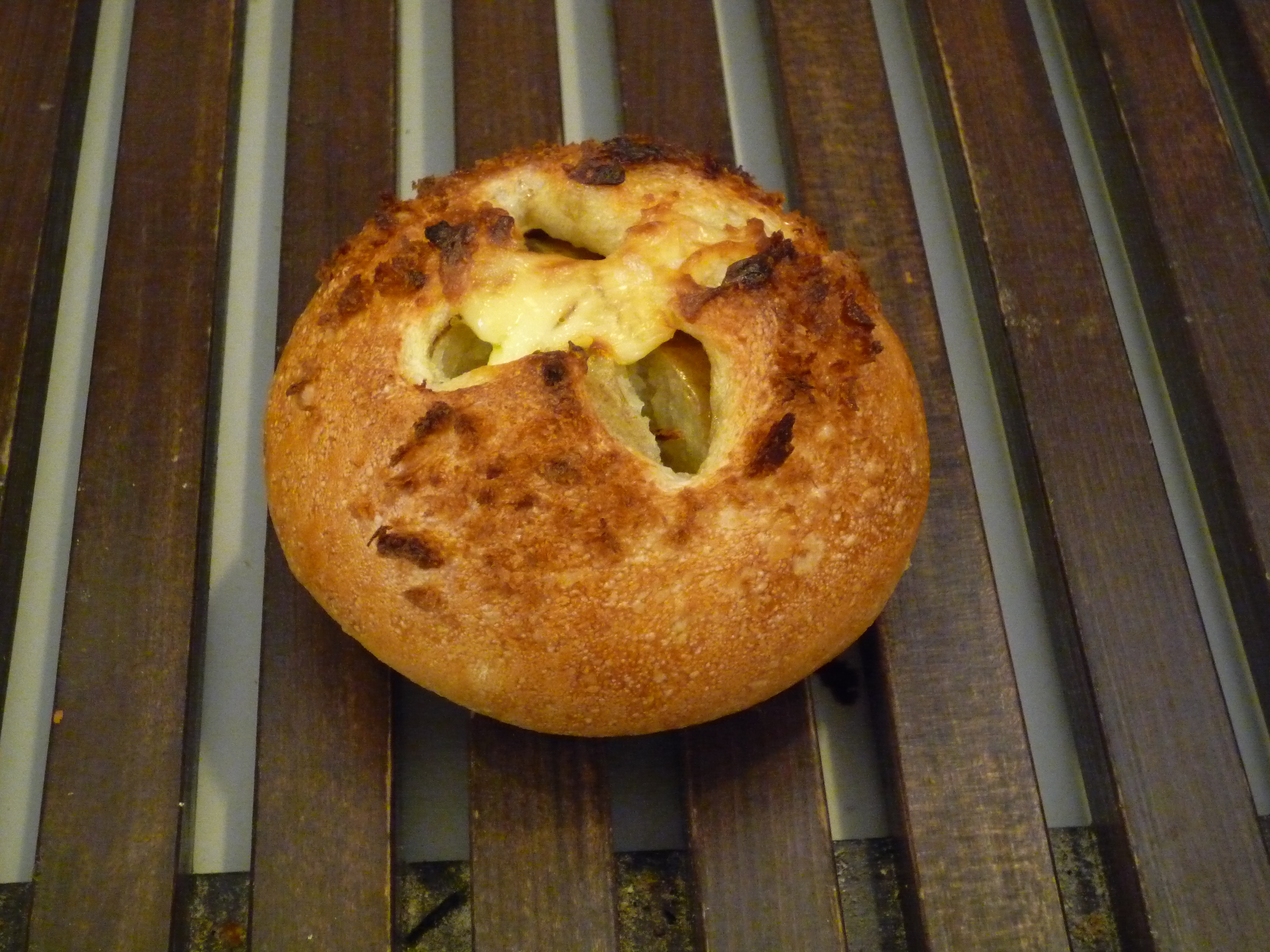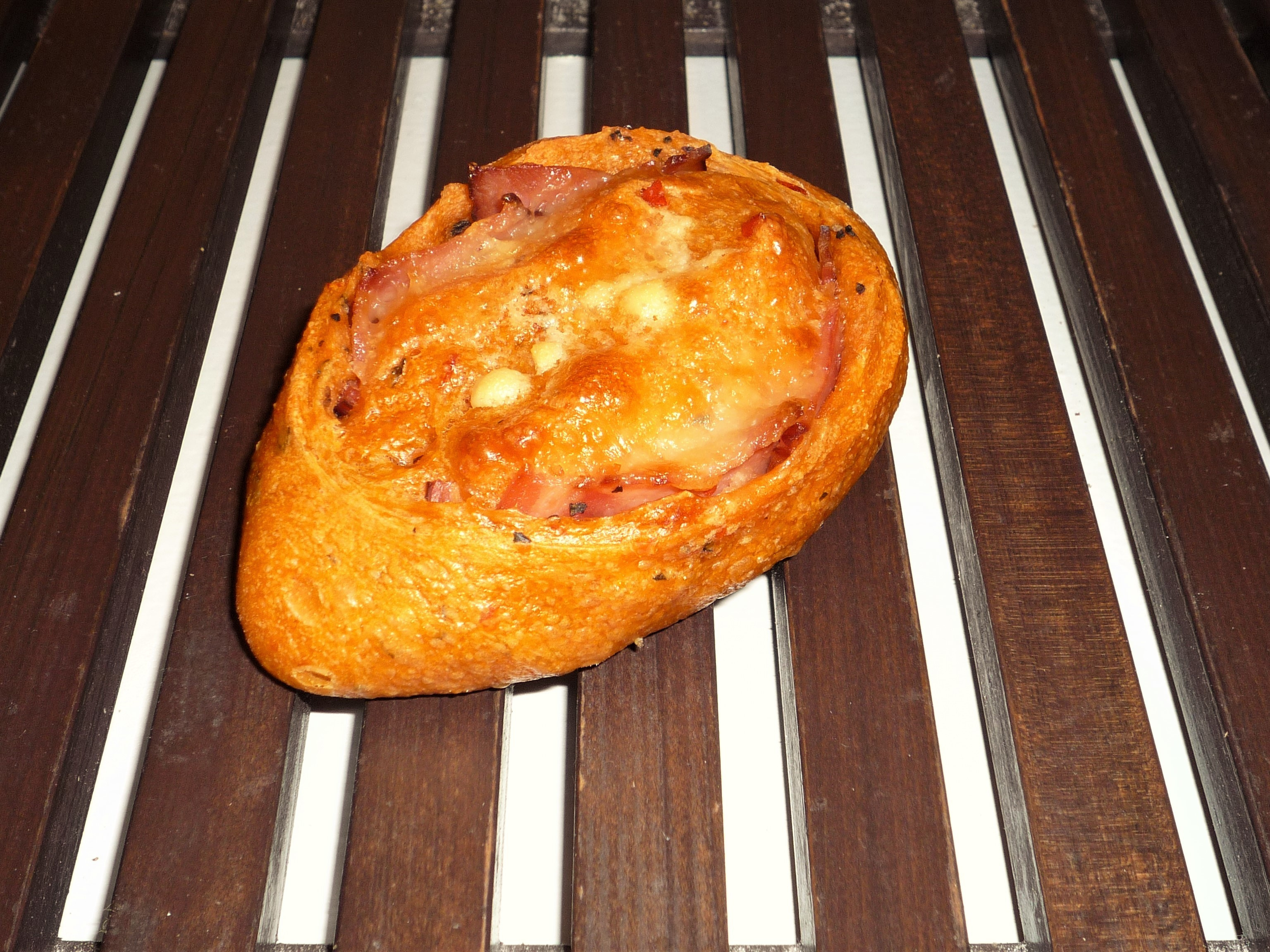自家製酵母を使用したトマト生地に、ベーコンとモッツァレラチーズを巻き込んで焼き上げました。