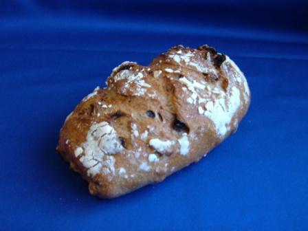 ぶどうによる自家製の酵母から熟成種を起こし、数日間かけて作り上げたお薦めの一品です。健康的な全粒粉を使用し、くるみとレーズンをたっぷり練り込んであります。アフターディナー等に、薄くスライスして、バターやクリームチーズ等を塗ってお召上がり下さい。