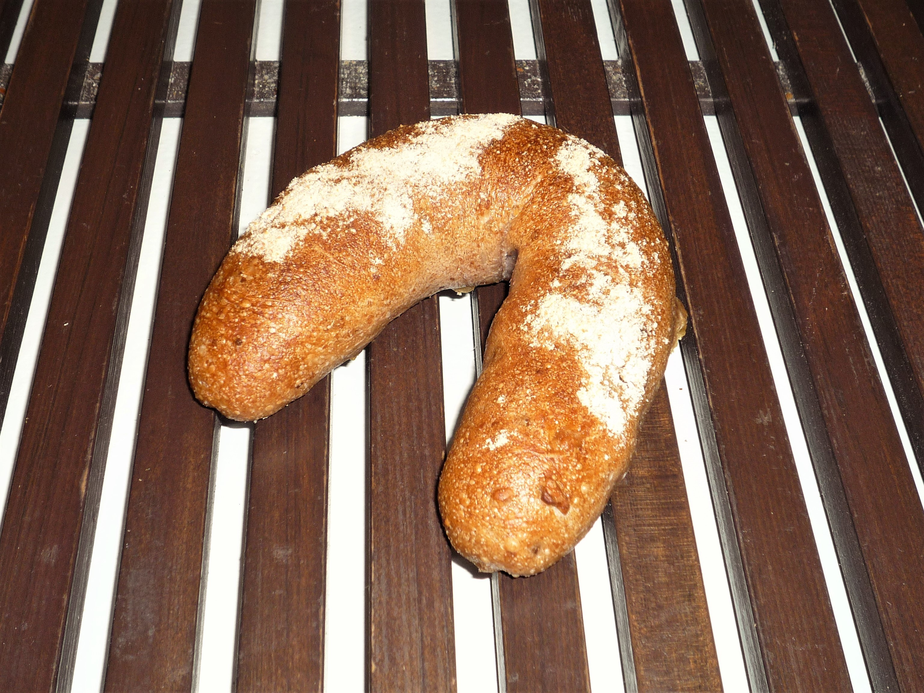 パンコンプレの生地にくるみを練り込み、ホワイトチョコレートを巻き込んで焼き上げました。表面にかかっている粉は、全粒粉を使用しています。テレビでも紹介されたお奨めの一品です。